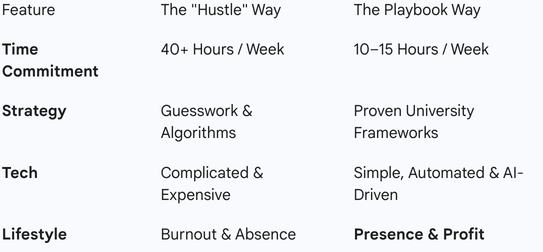 For parents who want both: profit and presence. The exact university-level framework I teach and used to replace my salary while raising two babies—without childcare, social media burnout or trading hours for dollars.