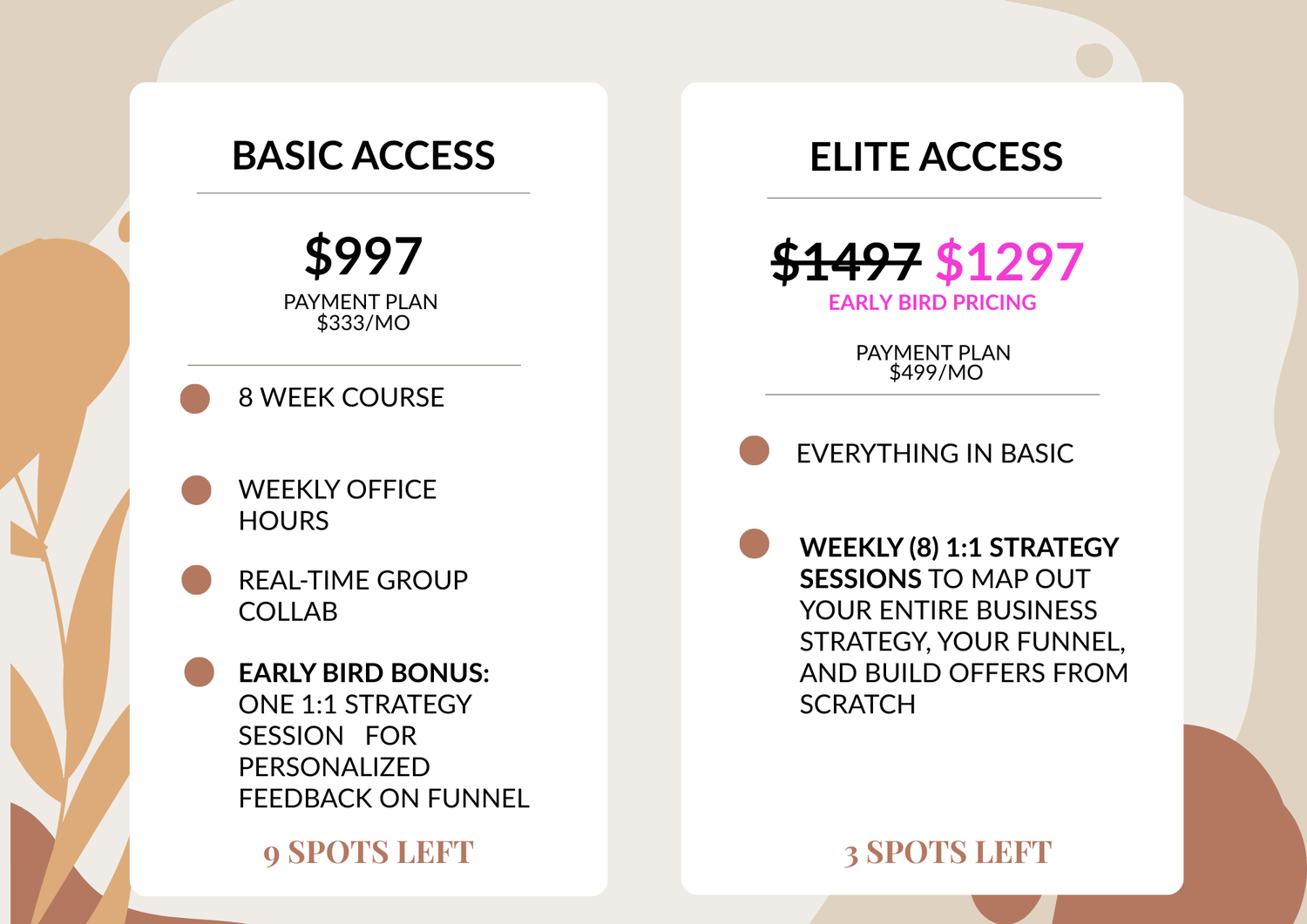 A: This is a virtual program with both, live support and recorded lesson plans. Each Sunday I'll send you a new recorded module to watch whenever it fits your life—morning, nap time, midnight. Then there's a weekly live Office Hours session where you can ask questions, get your funnel reviewed, and get direct feedback. You get the flexibility of self-paced learning with the accountability and support of a live coach. Not sure if this is right for you? Book a free 20-minute call with me now.